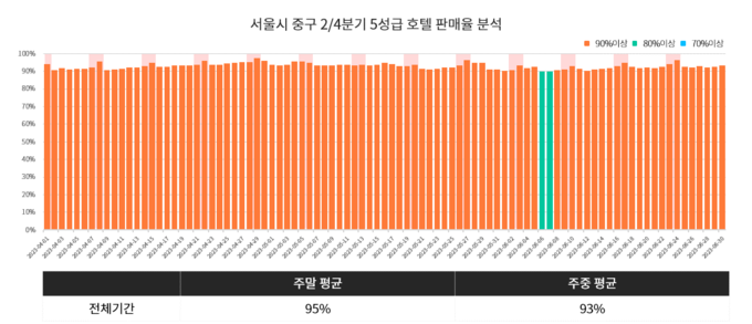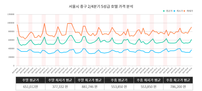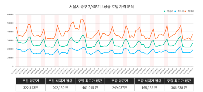 2023년 2분기 서울 중구 4성급 객실 판매가 분석 결과, 주말 평균 가격은 32만 2743원, 최고가 평균 46만 1915원, 최저가 평균 20만 2159원이었으며, 주중 평균 가격은 24만 9937원, 최고가 평균 36만 6,638원, 최저가 평균 16만 5155원으로 형성돼 있는 것을 알 수 있다. 주말 평균 가격의 경우 주중 평균 가격 대비 약 7만 2806원, 최저가격 역시 3만 7004원, 최고 가격은 9만 5277원 높게 나타났으며 객실 판매율은 주중 77%, 주말 84%다.