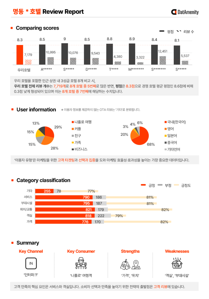 *데이터메니티 리뷰 리포트는 고객 리뷰로부터 서비스 향상 및 고객관리에 대한 인사이트를 얻는데 도움을 제공하기 위해 제작됐으며, 다음 리포트 예시는 본 기고의 ‘중구’ 편에 맞춰 명동에 위치한 3성급 비디오 슬롯 머신 1곳의 리뷰데이터를 바탕으로 작성됐다.따라서 본 리포트는 데이터메니티에서 제공하는 데이터를 기반으로 작성됐으며, 데이터메니티 가입 혹은 리포트 신청을 통해서 받아볼 수 있다.