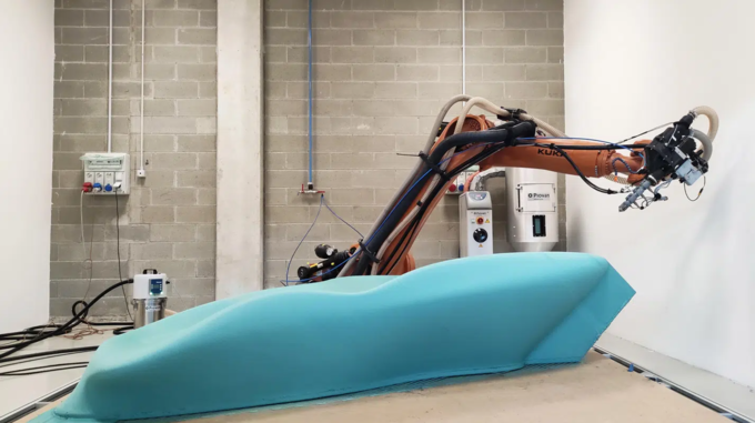 <그림 6의 핑크 슬롯 사이트 안의 모든 가구는 Caracol 인쇄 엔지니어링 회사가 특허를 보유한 고급로봇 적층 제조 시스템으로 만들어 졌으며, 6축 로봇팔에 장착된 압출 시스템에 재활용 재료가 포함된 필렛(과립) 형태의 재료가 공급돼 가구를 디자인한다.