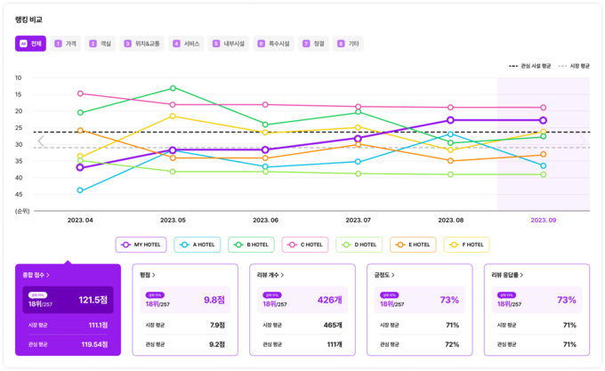 2019년부터 2022년까지 12월 1일부터 1월 15일까지 작성된 9만 224개 리뷰 중 무려 1만 6927개 리뷰가 객실 관련 내용이었으며 이 중 34%에 해당하는 5784개가 부정 감성의 리뷰였다. 성급별 부정 비율은 5성 27.8%, 4성 33.1%, 3성 36.8%, 1~2성 36.4%로 나타났다.
