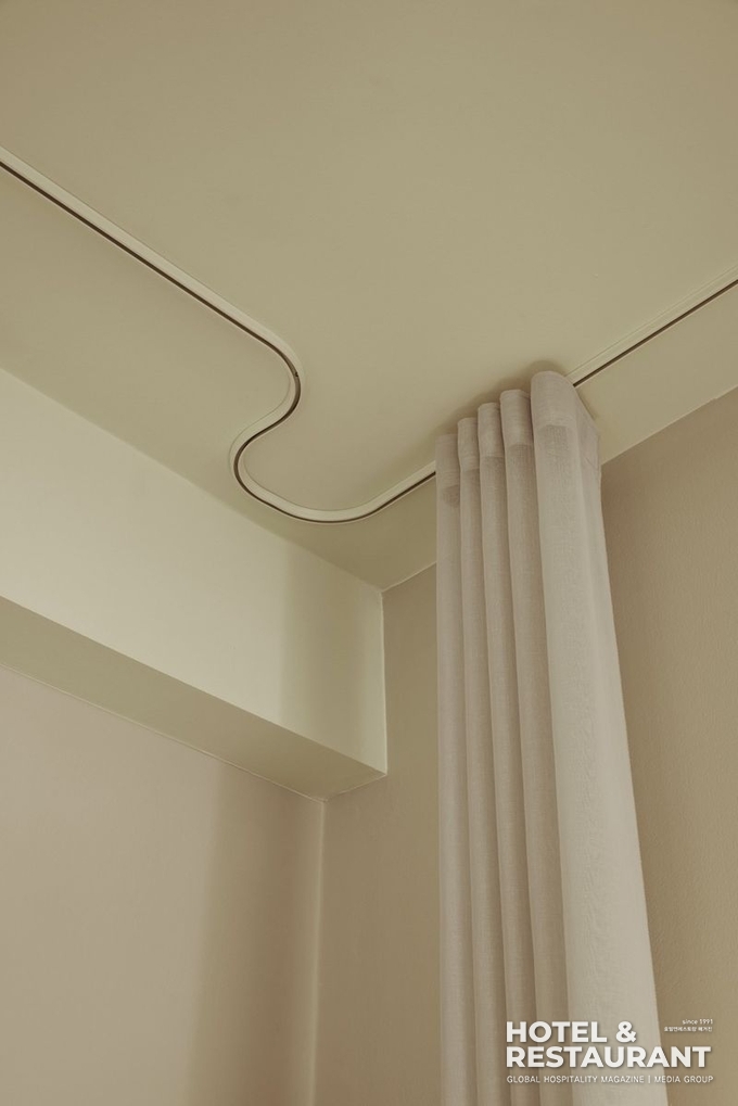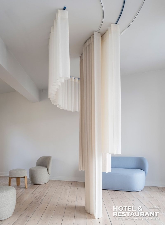 커튼을 활용해 <그림 3처럼 호텔 내 로비처럼 개방된 공간에 기능이나 이벤트에 따라 공간을 쉽고 효율적으로 사용할 수 있다. 특히 요즘 호텔 로비는 다양한 기능을 담고 있는데 공유 오피스나 집중이 필요한 업무공간 같이 소비자가 긴장을 풀 수 있는 편안한 환경을 기대하는 곳에서는 소음 차단 커튼을 사용해 공간을 분할할 수 있다. 또한 컨시어지, 대기실, 개방형 객실에서도 유기적 곡선의 커튼 레일을 설치해 창의적이고 다양한 기능을 담는 유동적인 공간디자인을 표현할 수 있다.