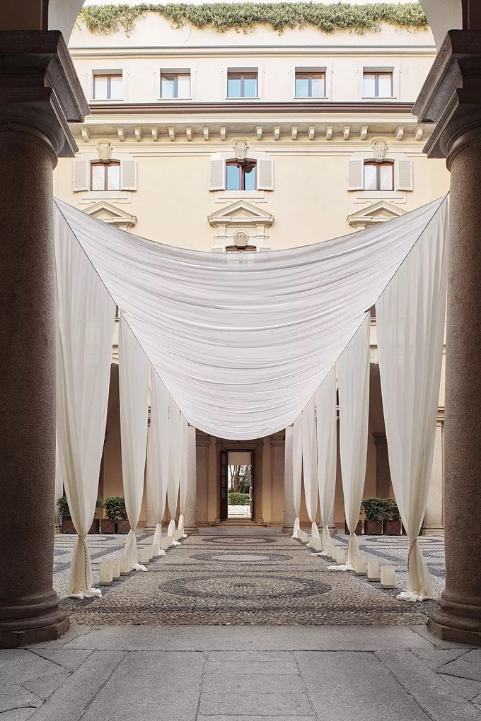 커튼 직물의 유연성과 가벼움을 활용해 커튼 디자인의 전체적인 모양과 형태를 공간에 맞게 연출할 수 있다. 특히 직물의 접힘, 주름, 밸런스를 고려한<그림 6은 캘리포니아주 패서디나에 있는 레스토랑으로 커튼의 주름, 다양한 드레이핑, 커튼 장식품을 이용해 식당의 4면을 커튼으로 마감했고 드라마틱하고 클래식한 공간디자인을 선뵈고 있다. 두꺼운 밧줄로 만들어진 커튼의 리프트와 주름은 주방에서 일하는 요리사의 모습을 드러낼 뿐만 아니라 거울 패널에 보이는 아치형 창문의 프레임 전망을 보여준다.