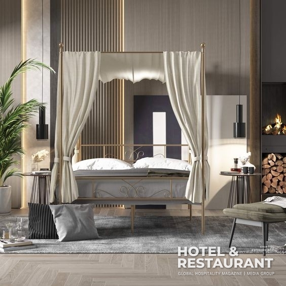호텔의 객실 안에서 커튼은 빛, 통풍의 차단 또는 욕실의 샤워커튼의 경우 물을 차단하거나 가리기 용도로만 생각했다. 여기에 투숙객들에게 좀더 나은 숙면을 제공하기 위해 캐노피 디자인으로 침실을 업그레이드 해보자. 캐노피는 중세시대부터 내려왔으며 인테리어적 효과보다는 실용성을 위해 사용됐다. 객실 안에 프라이버시, 소음과 조명으로부터 차단을 시켜주며 외부의 찬 공기로부터 침실공간의 따뜻한 보온효과를 높이고 흡음 직물 사용을 통해 좀 더 안정적이고 편안한 수면을 도와준다. 2023년 하임텍스틸 전시회에서도 캐노피를 활용한 침대가 호텔 주요 트렌드로 선뵀다. 물론 작은 크기의 객실에는 4면의 프레임이 세워져야 해서 답답한 감이 있지만 큰 평형의 객실에는 충분히 고려한 만한 공간 변화를 준다. 침실 캐노피는 때에 따라 <그림 10처럼 클래식하고 우아한 공간 연출도 가능하다.