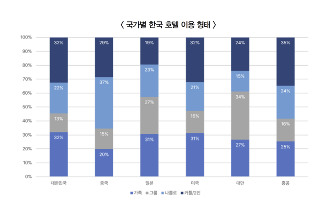가장 방문객이 많은 중국의 관광객 형태 조사 결과, 가장 많은 비율을 보인 것은 나홀로(37%) 여행이다. 이는 나머지 5개 국가 중 가장 높은 비율을 보이는 홍콩(24%)과 비교해도 13% 높은 수치로 상당히 큰 비율을 차지하고 있음을 알 수 있다.