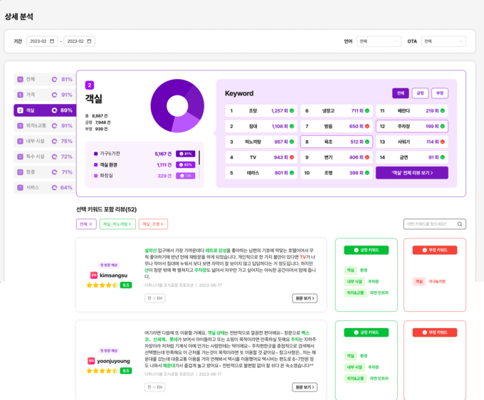 ‘리비(REVIE)’는 이러한 rtg 슬롯의 어려움을 해결하고 고객의 불만과 니즈를 좀 더 쉽게 파악할 수 있는 ‘리뷰 분석’ 기능을 제공하는 rtg 슬롯 전용 솔루션이다. 수많은 OTA에 흩어져 있는 리뷰를 수집해 한 번에 확인이 가능할 뿐 아니라 AI를 활용한 자동 답글 작성 및 실시간 대응이 가능하다. 수집된 리뷰 데이터는 rtg 슬롯 특성에 맞는 카테고리로 분류하고 긍·부정의 감성을 분석해 rtg 슬롯 강점과 보완점을 한눈에 파악할 수 있도록 대시보드 형태로 제시한다.