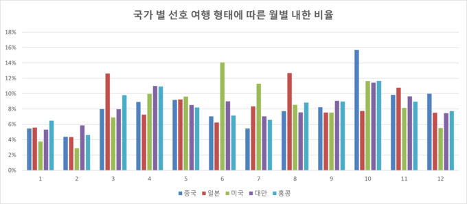중국은 대체로 고른 방문 비율을 보이지만 10월이 가장 높은 비율을 차지하고 있으며, 일본의 경우 3월과 8월이 높은 방문을, 상대적으로 가을에 방문이 적어지는 특징이 있다. 미국의 경우 중국과 비슷하게 고른 방문 비율을 보이지만, 특히 여름철 방문 비율이 높고, 대만 역시 고른 방문 비율을 보이지만 6월부터 10월까지 여름~초가을까지 방문 비율이 높음을 알 수 있다. 홍콩은 4월 12월 비율이 상당히 높고, 1월과 9월은 상대적으로 비율이 낮다.