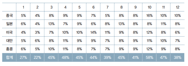※데이터는 코로나 등 특수 상황을 배제하기 위해 코로나 이전 데이터 활용전체 외래 관광객의 월별 내한 비율은 대체로 고르게 나타나고 있지만, 봄-가을-여름-겨울 순으로 높음을 확인할 수 있다. 하지만 국가별로 살펴보면 각각의 특징을 가지고 있음을 알 수 있다.