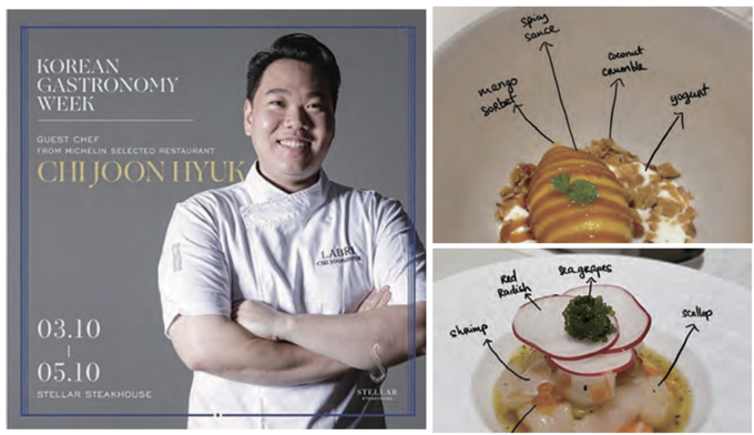 지난해에는 임산물을 주재료로 산에서 재배되고 자라는 인삼, 대추, 밤, 각종 산나물 등을 주요 식재료로 사용했다. 올해는 바다에서 나는 제주도 광어, 완도 전복, 게살, 멍게, 굴, 김, 미역, 다시마, 멸치 등의 식재료로 미쉐린 2스타의 알렌 셰프가 9월 27일에 진행된 오프닝 점심 갈라 온라인 슬롯 조작에 메뉴와 동시에 쿠킹 데모 클래스를 준비했다. 또한 9월 27일부터 3일간 인터컨티넨탈 하노이 랜드마크 72 호텔의 62층에 위치한 스텔라 스테이크 하우스에서 디너 온라인 슬롯 조작도 마련했다.