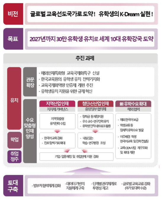 이는 정부가 주도하는 ‘Study Korea 300K’ 프로젝트의 일환이기도 하다. 스터디 코리아 300K 프로젝트는 오는 2027년까지 외국인 유학생 30만 명을 유치, 세계 10대 유학강국으로 도약하는 것을 목표로 한다. 특히 학위과정 유학생 22만 명 유치를 통해 산업 현장에 필요한 전문 인력을 확보하는데 초점을 맞추고 있다.