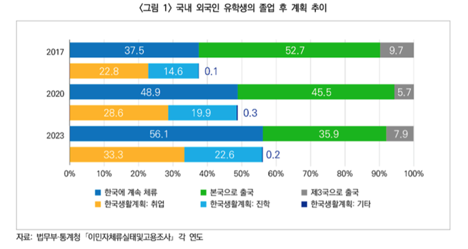 최근 이민정책연구원의 2024년 12월 통계 브리프는 이러한 정책의 잠재력을 뒷받침한다. 2017년부터 2023년까지의 조사 결과에 따르면, 졸업 후 한국 체류를 희망하는 유학생의 비율이 37.5%에서 56.1%로 크게 증가했다. 특히 취업 희망 비율은 22.8%에서 33.3%로, 진학 희망 비율은 14.6%에서 22.6%로 각각 상승했다.