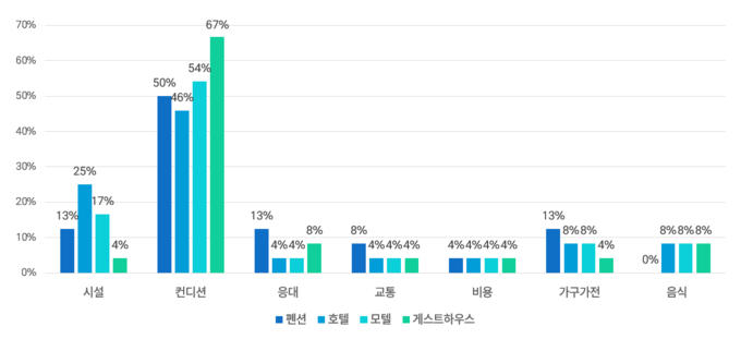 숙박시설을 선택하는 기준에서 비용이 가장 큰 요소로 고려되는 것과 반대로, 이용 후 부정적 리뷰에는 큰 비중을 차지하지 않았으며, 컨디션과 시설을 제외한 나머지 요소는 4~8%에서 큰 차이를 보이지 않았다.