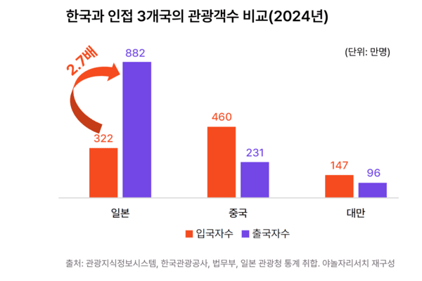 이러한 공급 불균형은 실제 관광객 수의 격차로도 나타난다. 2024년 해외 슬롯사이트을 방문한 한국인은 882만 명에 달했으나, 한국을 찾은 해외 슬롯사이트인은 322만 명에 그쳐 약 2.7배의 격차를 보였다. 공급 측면에서 이는 해외 슬롯사이트인의 방한을 위한 자국 항공편 선택지가 부족한 데서 기인한 것으로 추정되며, 관광수지 적자(약 100억 달러) 심화의 주요 원인으로 분석된다.