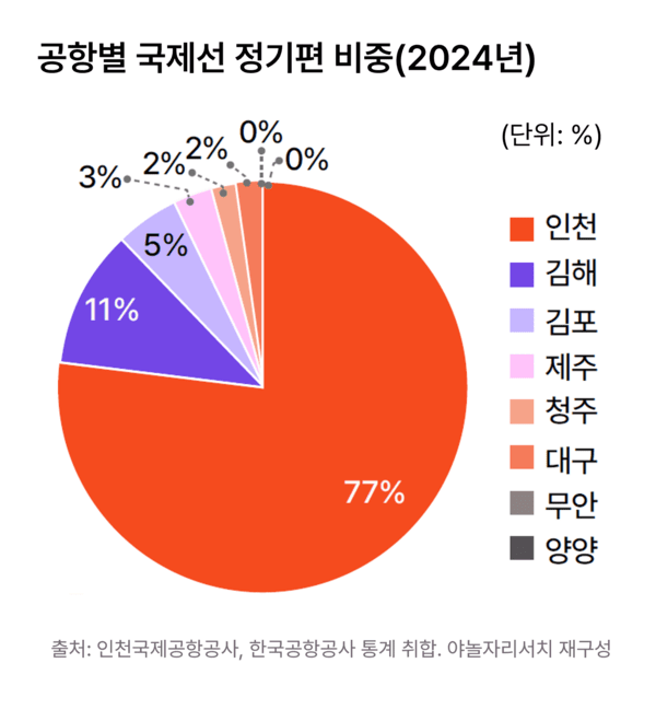 보고서는 인천공항이 2024년 국제선 여객편의 77%를 차지하며 팬데믹 이전 수준을 회복한 반면, 김해·제주·대구 등 주요 지방공항의 회복은 더딘 상황이라고 밝혔다. 특히 해외 슬롯사이트 항공사는 한국 지방공항에 정기편을 전혀 운항하지 않았으며, 김해공항의 경우 해외 슬롯사이트 항공사 운항이 ‘0편’임에도 약 29만 명의 해외 슬롯사이트인이 입국했다. 이는 해외 슬롯사이트인 입국이 전적으로 한국 항공사에 의존하고 있음을 보여준다.