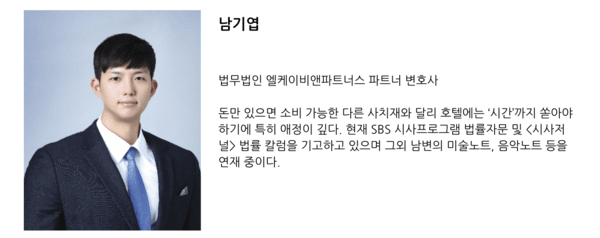 ✽남기엽 변호사가 책을 읽고, 호텔산업의 독자는 남기엽 변호사와 함께 책을 읽습니다. 사람과 접촉하고 상대를 읽어 내 마음을 비우게 하는 호텔산업에서 자아를 채우는 일은 중요합니다. 육체와 두뇌, 나아가 감정까지 저당잡히는 서비스업계에서 포기될 수 없는 책을 소개하고, 함께 읽어 나갈 것입니다.