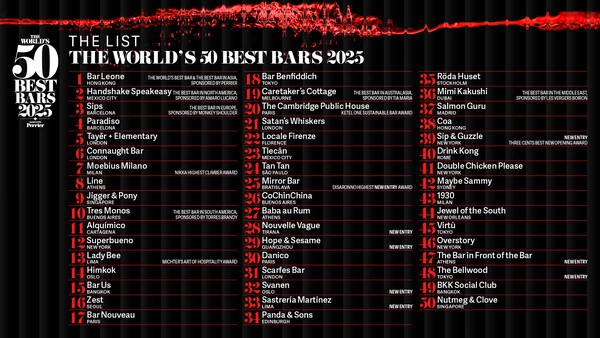 페리에(Perrier)가 후원하는 이번 행사는 10월 8일 홍콩에서 열린 시상식에서 전 세계 29개 도시 50개 바의 순위를 공개했다. 17회째를 맞은 올해 행사에는 아테네, 브라티슬라바, 광저우, 리마, 뉴욕, 오슬로, 티라나, 도쿄 등 8곳의 신규 진입 바가 포함됐다.