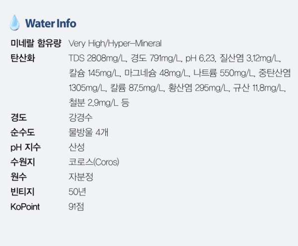 산 마르티노 광천수의 TDS는 2808mg/L, 경도는 791mg/L로 강경수이고, pH 6.23으로 산성물로 다양한 높은 미네랄을 함유하고 있다. 첫 모금부터 미세하고 우아한 기포감이 느껴지며, 중간 정도의 바디감과 짭짤한 산도가 있고, 부드러운 목 넘김과 더불어 미네랄 풍미가 길고 깔끔한 여운이 매력적이다.