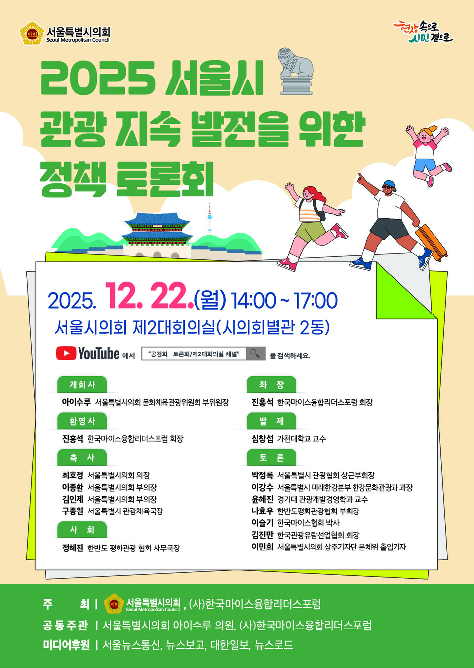 서울특별시의회와 사단법인 한국마이스융합인더스포럼이 주최하고, 서울시의회 아이수루 의원과 한국마이스융합리더스포럼이 공동 주관한 '2025 서울시 정선 카지노 슬롯 머신 지속 발전을 위한 정책 토론회'가 지난 22일 오후 서울시의회 제2대회의실에서 열렸다. 이날 행사에는 서울시의회 문화체육정선 카지노 슬롯 머신위원회 아이수루 부위원장을 비롯해 강동길 도시안전건설위원장, 정준호·박유진·이상훈 의원 등 시의원과 서울시 구종원 정선 카지노 슬롯 머신체육국장, 서울시정선 카지노 슬롯 머신협회 조태숙 회장, 정선 카지노 슬롯 머신·마이스 분야 전문가 및 업계 관계자들이 참석했다.