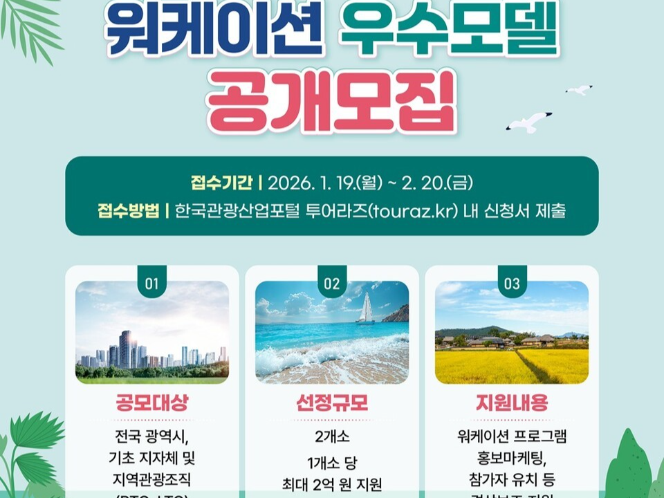 한국관광공사(사장 박성혁, 이하 공사)는 1월 19일부터 2월 20일까지 전국 지자체를 대상으로 ‘2026 슬롯사이트 벳엔드 우수모델’ 공모를 한다. 이번 공모는 지자체와 지역 주민, 인근 상권이 함께 상생하는 슬롯사이트 벳엔드 우수모델을 발굴, 육성하기 위해 마련됐다.