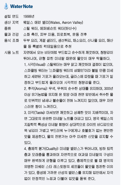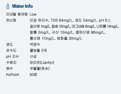 란리르 소스 워터는 잘 보존된 웨스트 웨일스 서부의 에런 밸리(Aeron Valley)에서 생산하는 프리미엄 워터다. 국제 워터품평회에서 많은 수상 경력을 가진 천연 샘물이며 뛰어난 순도, 부드러운 맛, 균형 잡힌 미네랄 함량 등으로 영국의 ‘스파클링 워터스의 샴페인’이라 불린다. 영국 런던의 유명한 5성급 호텔 레스토랑, 미쉐린 스타 셰프들이 가장 선호하는 란리르 소스 워터의 역사는 1180년경으로 거슬러 올라간다. 로드 리스 압 그리피드(Lord Rhys ap Gruffydd)가 설립한 시토회 수녀원(Cistercian Nunnery)이 357년간 사용한 우물 샘에서 취수하면서 시작됐다. 과거 란리르 에스테이트 성지의 고대 우물 샘에서 끊임없이 샘솟는 물은 현재 유리병이나 재활용이 가능한 알루미늄으로 병에 담아 판매되고 있으며, 고품격 먹는샘물로 높은 평가를 받으면서 고급 레스토랑에서 인기를 끌고 있다.