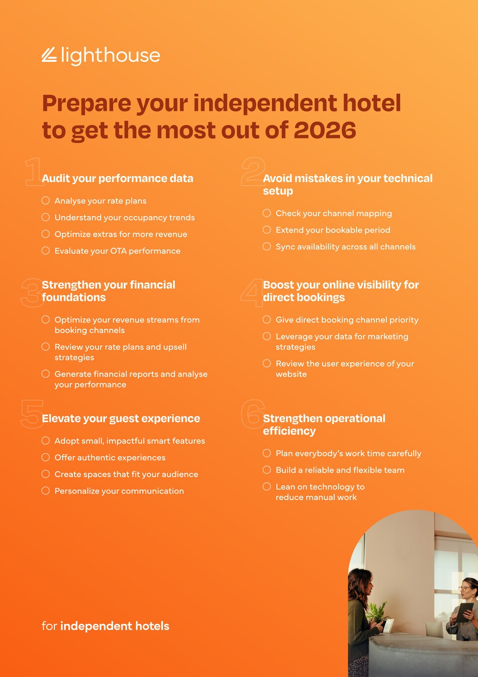 라이트하우스(Lighthouse)가 발표한 ‘2026년 독립 호텔을 위한 준비 체크리스트’는 독립 호텔들이 2026년을 대비해 점검해야 할 핵심 과제를 제시한다. △성과 데이터 감사(요금제 분석, 객실 점유율 트렌드 파악, 부가 수익 최적화, OTA 성과 평가) △기술 설정 오류 방지(채널 매핑 확인, 예약 가능 기간 연장, 모든 채널 간 가용성 동기화) △재무 기반 강화(예약 채널별 수익 흐름 최적화, 요금제와 업셀 전략 검토, 재무 보고서 생성 및 성과 분석) △다이렉트 부킹을 위한 온라인 가시성 향상(다이렉트 부킹 채널 우선순위 부여, 마케팅 전략을 위한 데이터 활용, 웹사이트 사용자 경험 검토) △고객 경험 향상(작지만 영향력 있는 스마트 기능 도입, 진정성 있는 경험 제공, 고객층에 맞는 공간 조성, 커뮤니케이션 개인화) △운영 효율성 강화(모든 직원의 근무 시간 신중하게 계획, 신뢰할 수 있고 유연한 팀 구축, 수작업 감소를 위한 기술 활용) 등이다. 폭증이라는 호재와 비용 상승이라는 악재가 교차하는 가운데 전반적인 상승세를 이어갈 것으로 전망된다. 다만 고급 호텔과 중급 호텔, 서울과 지방, 글로벌 체인과 로컬 독립 호텔 간의 격차는 더욱 벌어질 가능성이 크다. 결국 호텔들은 단순한 가격 인상이 아니라, 데이터 기반의 정교한 레비뉴 매니지먼트를 통해 수익성과 경쟁력의 균형점을 찾아야 한다. 2026년은 한국 호텔산업에 있어 ‘레비뉴 매니지먼트의 진화’가 성패를 가르는 한 해가 될 것이다