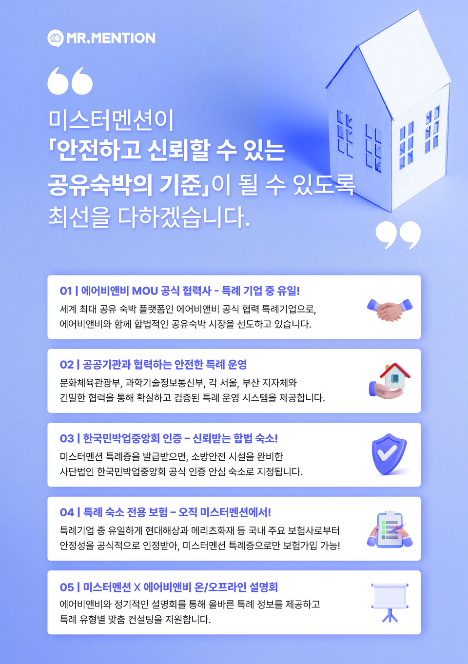 이번 실증사업의 운영사는 중장기 숙박 서비스 플랫폼 ‘미스터멘션’이다. 미스터멘션은 에어비앤비(Airbnb)와 업무협약(MOU)을 체결한 공식 협력사로, 에어비앤비와 연동된 OTA를 통해 예약을 접수하고 숙박을 제공하는 구조를 갖추고 있다. 숙소는 한국민박업중앙회의 현장심사를 통과해야 ‘안심숙소’로 인증되며, 현대해상·메리츠화재 등 국내 주요 보험사의 숙소 전용 보험 가입도 미스터멘션 특례증을 통해서만 가능하다. 이번 실증사업은 500객실로 운영 규모가 한정되며, 지역·운영방식 등 세부 조건은 관계부처와의 협의를 통해 확정해 나갈 계획이다. 다만 업계 일각에서는 이번 실증사업의 실행 주체로 특정 플랫폼이 선정된 배경에 의문을 제기한다. 비대면 신원확인과 실시간 모니터링 기술을 보유한 업체가 시장에 다수 존재하는 상황에서, 선정 기준과 절차가 충분히 공개되지 않았다는 것이다. 실증사업의 신뢰성을 높이기 위해서는 플랫폼 선정 과정의 투명성 확보가 병행돼야 한다는 목소리도 나온다.